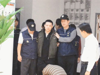 吳東威(中)等人涉嫌放高利貸,為追討14萬元債務(wù)逼死陳綾蕙,昨天被警方逮捕。圖片來源:臺(tái)灣《聯(lián)合報(bào)》