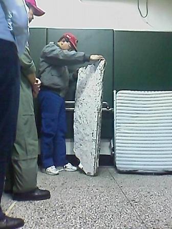 今天下午3點(diǎn)多鐘,花蓮縣北埔派出所接獲漁民報(bào)案,指稱在七星潭海域發(fā)現(xiàn)一塊疑似3月4日墜海的臺(tái)空軍F16戰(zhàn)機(jī)殘骸,于是警察派員前往將這塊長約1米、寬約40厘米的銀河鐵塊帶回,放置在派出所的偵訊室中,由臺(tái)軍方進(jìn)行鑒定。