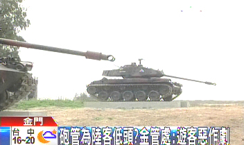 據(jù)臺(tái)灣TVBS報(bào)道,在金門慈湖有10輛不同類型的退役裝甲車,供民眾欣賞,體驗(yàn)戰(zhàn)地風(fēng)情,但卻傳出因?yàn)槠渲?輛裝甲車的炮管射口,朝向?qū)Π叮鸫箨懹^光客反彈,后來裝甲車的射口就變成朝下,垂頭喪氣的樣子,金管處澄清,那可能是游客愛玩,不要有太多政治聯(lián)想。
