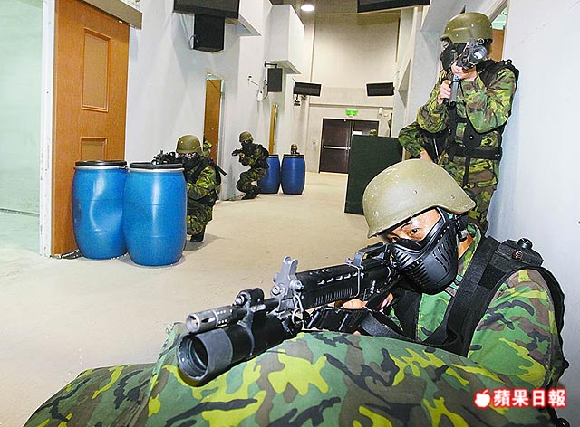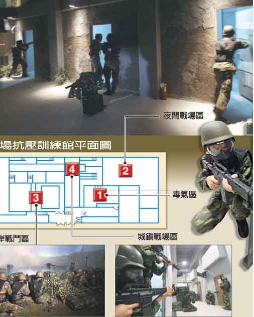 臺灣“中科院”花新臺幣3億余元打造的戰(zhàn)場模訓(xùn)館,南北各一座,受測官兵必須全副武裝,在50分鐘內(nèi)利用有限彈藥,快速通過毒氣區(qū)、夜戰(zhàn)區(qū)、灘岸區(qū)及巷戰(zhàn)區(qū),并殲滅敵人。
