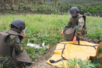 臺(tái)陸軍未爆彈處理小組人員檢視墜落莊姓民宅旁田里的“陶”式導(dǎo)彈尾翼,放入防爆毯帶回處理。(圖片來(lái)源:臺(tái)灣《聯(lián)合報(bào)》)