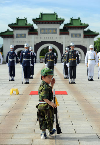 以雨傘模擬“儀仗隊”操槍在島內(nèi)網(wǎng)絡暴紅的3歲男童 Ryan(前)15日如愿以償,獲臺軍方頒贈205兵工廠制造的仿真迷你木槍,并在臺北忠烈祠與“三軍儀仗隊”一同操槍。 圖片來源:臺灣“中央社”