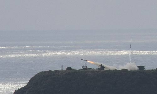 屏東九鵬基地18日舉行“聯(lián)合防空火力實彈射擊測考”,前后共發(fā)射2枚車載劍一導彈。 “中央社”圖