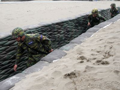 臺陸軍六軍團關渡指揮部扮演防衛(wèi)角色,共出動1個排的兵力,在河岸設置鋼刺猬、燃油桶、雷區(qū)、蛇腹形鐵絲網等阻絕設施,讓敵人難以登陸。岸上還有士兵持機槍和步槍,以交叉火網殲滅來犯敵人。