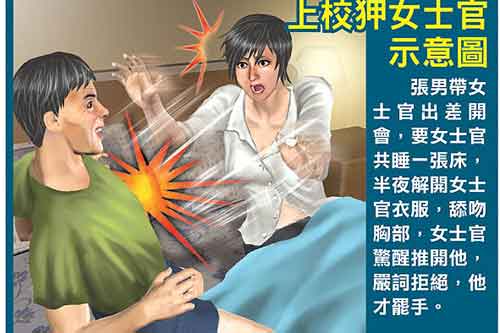 臺(tái)軍受害女士官指控,2008年11月,張男(49歲)利用權(quán)勢(shì)將她調(diào)到作戰(zhàn)中心,成為她的直屬長(zhǎng)官,再以她有多名臺(tái)軍官追求,交往復(fù)雜影響公務(wù)為由,保管她的手機(jī)SIM卡,并趁機(jī)查看她的通話記錄和短信內(nèi)容。她說(shuō),同年11月至2009年3月,張男假借洽談公事或共同參加戰(zhàn)情講習(xí),先后5次安排與她同住僅有一張雙人床的汽車旅館或商務(wù)旅館。其中一次,張男趁她睡著后對(duì)她強(qiáng)吻、摸胸、吸奶,她驚醒后推開(kāi)張男嚴(yán)詞拒絕,張男才停止。
