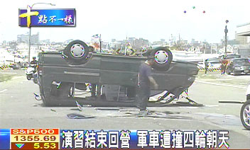 駕駛軍車的駕駛兵說,他們才剛結(jié)束演習(xí)任務(wù),要回到營區(qū),卻被一輛白色轎車從側(cè)邊撞擊,導(dǎo)致翻覆,駕駛兵和押車的中校軍官都受到輕傷,不過沒有大礙。