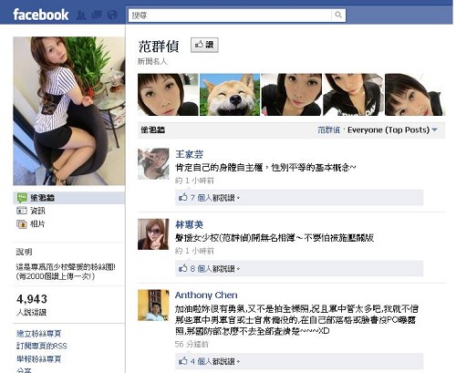 范群偵的粉絲專頁一上線已有近5000人按贊,相簿則搜集了范偵群超過300張的性感照片,不少網友聲援她,贊她很有勇氣,還說她若出寫真集必買。(中國臺灣網 馮江)