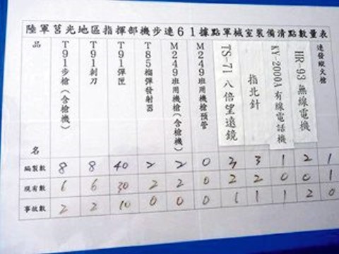 中國臺(tái)灣網(wǎng)1月15日消息 據(jù)臺(tái)灣今日新聞網(wǎng)報(bào)道,日前網(wǎng)上披露了一張臺(tái)灣馬祖陸軍莒光地區(qū)指揮部61據(jù)點(diǎn)的武器清點(diǎn)表,照片中據(jù)點(diǎn)單兵的武器配備數(shù)量、據(jù)點(diǎn)火力、妥善率全都有,被質(zhì)疑保密紀(jì)律松散。