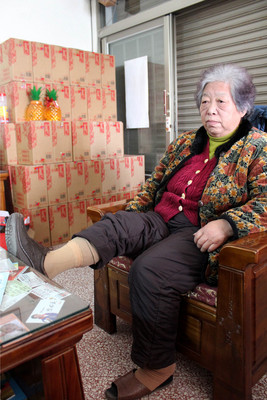 72歲的陳張麗玉17歲時在金門海邊被地雷炸斷右小腿。她出示右小腿義肢,提醒世人地雷的可怕。(圖片來源:臺灣“中央社”)