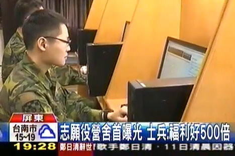 臺(tái)軍陸軍在13日下午進(jìn)行戰(zhàn)備操演,同時(shí)針對外界批評的募兵制征不到人,也特別公開實(shí)驗(yàn)中的志愿役營區(qū),比起過去營區(qū)當(dāng)兵的擁擠睡鋪,號稱寢室內(nèi)每個(gè)人都有“一床一柜一桌”;而休閑中心也走美式風(fēng)格,有民營網(wǎng)絡(luò)可提供上網(wǎng),還有電視游樂器,旁邊也附設(shè)健身器材,還有撞球桌,投籃機(jī)等,根本就像是個(gè)游樂場。