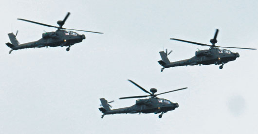 日前慶祝黃埔90周年紀(jì)念活動(dòng)上,臺(tái)灣陸軍三架阿帕奇攻擊直升機(jī)編隊(duì)進(jìn)行空中分列,接受馬英九校閱,現(xiàn)在傳出機(jī)上有尚未合格的飛官,引起爭(zhēng)議!。▓D片來源:臺(tái)灣《聯(lián)合報(bào)》)