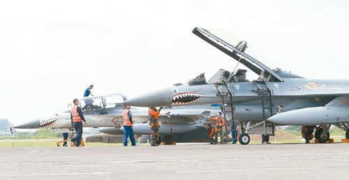 據(jù)臺灣《聯(lián)合報》報道,為慶?箲(zhàn)勝利70周年,臺灣空軍特別在現(xiàn)役F—16、IDF戰(zhàn)機(jī)“重現(xiàn)”飛虎隊(duì)鯊魚頭涂裝,彩繪機(jī)8日在新竹基地亮相,讓軍事迷興奮不已。