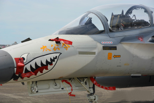 據(jù)臺灣媒體報道,為紀念對日抗戰(zhàn)勝利70周年,臺空軍日前在新竹空軍基地展示彩繪成二戰(zhàn)時期“中國空軍美籍志愿大隊(即飛虎隊)”鯊魚頭涂裝的IDF與F-16戰(zhàn)機。機上繪有日本國旗,象征戰(zhàn)時被擊落的日本戰(zhàn)機。