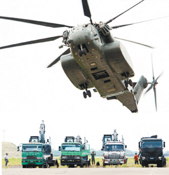 美方馳援臺(tái)灣“88水災(zāi)”的MH-53E型“種馬”直升機(jī)昨天飛抵臺(tái)軍的臺(tái)南軍用機(jī)場(chǎng)。圖片來(lái)源:臺(tái)灣《聯(lián)合報(bào)》