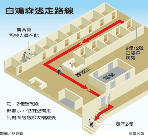 據(jù)悉,前天中午白鴻森還和小女兒共進午餐,但兩名警員卻未跟隨在旁,白鴻森趁警員平日松散、疏于戒備,直接從九樓病房走出來,三兩步踱越長廊,走進病房正對面的安全梯,拾級而下到二樓,再往門診大樓方向,宛如走自家后院般,一路暢行無阻,揚長而去。