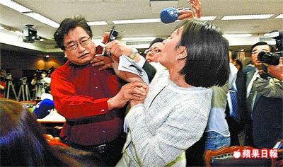 邱議瑩去年在臺灣“立法院”竟然打國民黨“立委”李慶華耳光,引起島內(nèi)輿論一片嘩然,從此兇悍之名遠(yuǎn)播。來源:臺灣《蘋果日報(bào)》