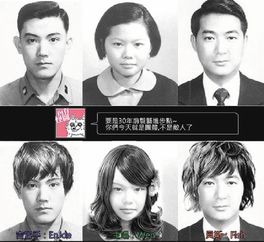三位2012年臺灣地區(qū)領(lǐng)導(dǎo)人候選人年輕時期的照片,顯得靦腆、青澀,就有網(wǎng)友用修圖軟件kuso(惡搞)照片,幫三位候選人改變了新潮的發(fā)型,網(wǎng)友說,“要是30年前發(fā)藝(理發(fā)技術(shù))夠進步,他們現(xiàn)在就不會是敵人,而是樂團團體!庇芯W(wǎng)友說,馬英九從年輕到現(xiàn)在都很帥,有人說他換上新發(fā)型之后,長得像彭于晏,有網(wǎng)友夸贊蔡英文換了發(fā)型之后,臉變小、也變漂亮了!