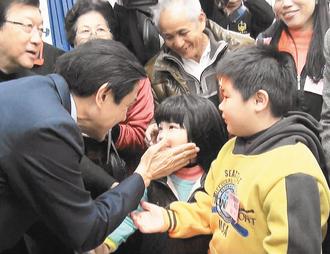 馬英九昨天到新竹縣謝票,看到幼童親切彎腰,輕撫臉頰。(圖片來自臺灣媒體)