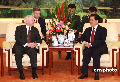 十一月六日,中國國家主席、中央軍委主席胡錦濤在北京人民大會堂會見美國國防部長羅伯特·蓋茨。 中新社發(fā) 廖文靜 攝