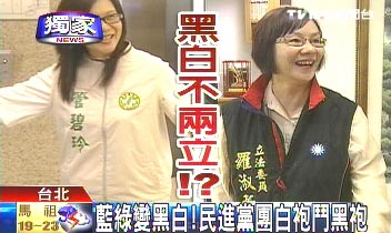 報(bào)道稱,“立法院”議場內(nèi),“立委”穿得花花綠綠難分你我,以后在議場對決,都穿戰(zhàn)袍的話就會變成“黑白分明”,國民黨黑、民進(jìn)黨白,對綠營有無形的加分效果;不過,國民黨“立委”卻說一幫人穿得這么白,實(shí)在不吉祥。