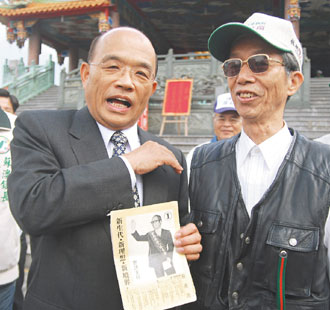 蘇貞昌(左)昨到宜蘭輔選,支持者林阿山拿出30年前的老文宣,向他要簽名。來源:臺灣《聯(lián)合報》