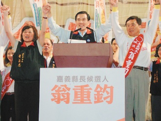 國民黨主席馬英九(中)昨晚到嘉義,高舉縣長候選人翁重鈞(右)及嘉義市長候選人黃敏惠(左)的手,為兩人輔選。來源:臺灣《聯(lián)合報》