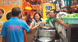 民進黨主席蔡英文(右二)與嘉義市長候選人涂醒哲(右一)昨晚在嘉義市文化路掃街拜票。來源:臺灣《聯(lián)合報》