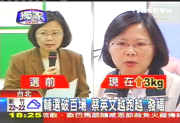蔡英文本來(lái)就不是瘦尖臉形,現(xiàn)在看起來(lái),雙頰下巴更成了一道圓弧線,體重增加3公斤,賣力抬轎輔選,怎么會(huì)越抬,自己越福態(tài)?蔡英文稱,“因?yàn)樾谐瘫容^緊湊,吃的地方都不定時(shí),也不知道在哪里,所以每一頓都要吃得很飽。”