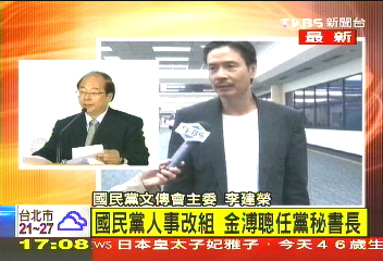 國民黨文傳會主委李建榮:“年底之前,有一個(gè)重要的人事案,為了因應(yīng)黨內(nèi)的工作需要,本黨副主席兼中央委員會秘書長詹春柏同志,免兼秘書長職,并改任專職副主席,所以原秘書長職缺,由金溥聰同志擔(dān)任!保ǜ叽罅郑