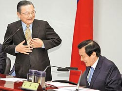 昔日最佳戰(zhàn)友及伙伴再度歸隊(duì),馬英九的好心情全寫在臉上,掩不住笑意。在常會(huì)進(jìn)行過程,馬亦頻頻與坐在右手邊的金溥聰?shù)驼Z,交換意見。