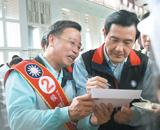 馬英九(右)晚間將陪同嘉義縣“立委”候選人林德瑞(左)到新港造勢(shì)。 來(lái)源:臺(tái)灣《聯(lián)合晚報(bào)》