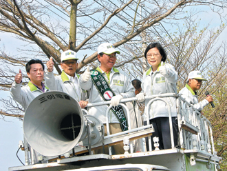 民進(jìn)黨主席蔡英文(右二)上午陪同嘉義縣“立委”候選人陳明文(左三)車隊(duì)掃街造勢(shì)。 來(lái)源:臺(tái)灣《聯(lián)合晚報(bào)》