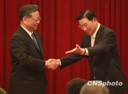 5月5日,臺(tái)灣;鶗(huì)董事長江丙坤在臺(tái)北圓山大飯店舉行午宴,歡迎福建省長黃小晶率福建省經(jīng)貿(mào)文化交流團(tuán)來臺(tái)訪問。兩位老朋友相見甚歡,期待透過此次訪問進(jìn)一步推動(dòng)兩地全方位交流合作。 中新社發(fā) 羅欽文 攝