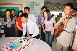 生日還是要過,楊秋興昨天生日,高雄縣府員工為他慶生,特別訂制有他圖象的蛋糕。而民進黨主席蔡英文送到高雄縣府慰問楊秋興的盆花,一度被擺放在縣長室外。圖片來源:臺灣《中國時報》