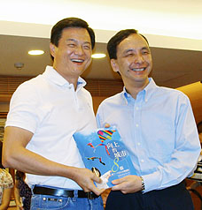 國(guó)民黨新北市長(zhǎng)參選人朱立倫(右)辭官后,18日就來(lái)到臺(tái)北縣政府拜會(huì)臺(tái)北縣長(zhǎng)周錫瑋(左),氣氛融洽。圖片來(lái)源:臺(tái)灣“央廣新聞”