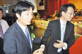 大臺(tái)南市長參選人賴清德(左)和郭添財(cái)(右)昨天在臺(tái)南大學(xué)畢業(yè)典禮上“王見王”,相互握手致意。(圖片來源:臺(tái)灣《聯(lián)合報(bào)》)