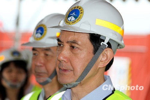資料圖:5月30日,臺灣當局領(lǐng)導(dǎo)人馬英九視察正在改建中的臺北松山機場,他三度詢問松山機場是否可降波音747飛機,并認為兩岸航班雖增加還是不足,至少每周要500多班才夠。圖為馬英九頭戴安全帽,在松山機場聽取簡報。 (董會峰 攝)