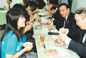 浙江省長呂祖善昨參訪臺灣大學(xué),午餐時與臺大學(xué)生輕松地話家常。圖片來源:臺灣《聯(lián)合報》
