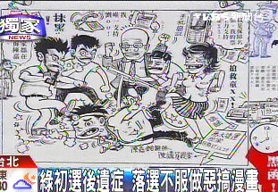 據(jù)臺(tái)灣TVBS電視臺(tái)報(bào)道,民進(jìn)黨臺(tái)北市議員提名已經(jīng)完成民調(diào)初選,但初選造成的傷痕余波蕩漾,被擠掉的現(xiàn)任議員陳嘉銘不服,質(zhì)疑初選公平性,制作惡搞漫畫丑化同黨其它參選人,畫中人火爆怒目、拳腳相向,就連“天王”蘇貞昌也被畫成香腸嘴跟大鼻孔。