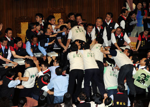 臺(tái)灣“立法院”臨時(shí)會(huì)8日審議ECFA(兩岸經(jīng)濟(jì)合作框架協(xié)議),由于民進(jìn)黨暴力阻撓表決,現(xiàn)場爆發(fā)肢體沖突,多名“立委”掛彩,混亂中通過將ECFA等案徑付二讀。