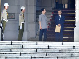 臺“司法院長”賴英照請辭獲準(zhǔn),“司法院副院長”謝在全(右1)18日下午獲馬英九召見,在短暫會晤后,謝在全離開馬英九辦公室。 圖片來源:“中央社”