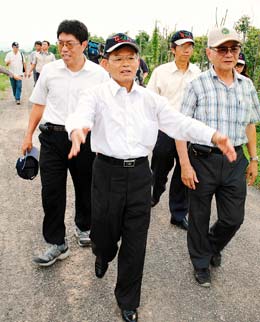 高雄縣長楊秋興(前)于4日到杉林鄉(xiāng)永齡有機(jī)農(nóng)場視察,他重申“心意已決”,決心走自己的路。 圖片來源:臺(tái)灣《聯(lián)合報(bào)》