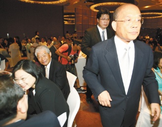 資料圖:蘇貞昌和蔡英文7月4日晚共同出席一場募款餐會,兩人同臺,互動很少,相敬如“冰”。