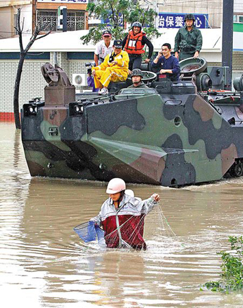 臺軍方出動水陸兩棲戰(zhàn)車至高雄市楠梓區(qū)緊急救援,有些民眾則在水里悠閑地捕魚。 來源:臺灣《中國時報》