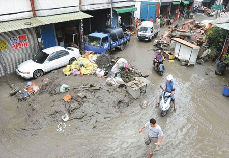 “凡亞比”臺風(fēng)造成臺灣南部災(zāi)情慘重,20日高雄縣仁武中華村積水退去,居民忙著清洗房子,街道上堆滿爛泥、垃圾。來源:臺灣《中國時報》