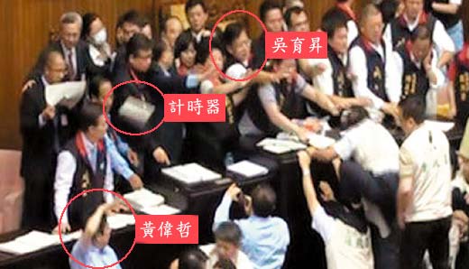 臺(tái)灣“立法院臨時(shí)會(huì)”今年7月8日處理兩岸經(jīng)濟(jì)合作框架協(xié)議(ECFA)逕付二讀時(shí),藍(lán)綠發(fā)生推擠沖突,混亂中吳育升遭計(jì)時(shí)器砸中。國民黨“立法院”黨團(tuán)事后調(diào)出錄像帶發(fā)現(xiàn),原來是民進(jìn)黨“立委”黃偉哲以“勾射”方式,冷不防向國民黨“立委”群集處拋出定時(shí)器,不偏不倚砸中國民黨“立委”吳育升頭部。