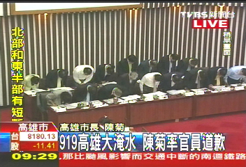 中國臺(tái)灣網(wǎng)9月28日消息 綜合臺(tái)灣媒體報(bào)道,針對“凡亞比”臺(tái)風(fēng)造成高雄大淹水,市長陳菊遭到相當(dāng)多指控,在今(28)日上午的高雄市議會(huì)總質(zhì)詢時(shí),陳菊特別率領(lǐng)高雄市府官員向市民鞠躬道歉。