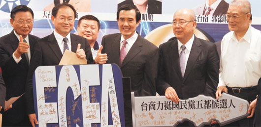 國(guó)民黨“五都”市長(zhǎng)選舉世界臺(tái)商后援總會(huì)昨天成立,會(huì)長(zhǎng)蔡國(guó)泰(左二)與馬英九(中)、吳敦義(右一)等,一起表達(dá)支持ECFA的決心。(圖:臺(tái)灣《聯(lián)合報(bào)》)