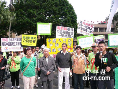 3日中午民進(jìn)黨“立委”蔡同榮等人赴臺“行政院”,反對給予在臺失蹤和罹難的大陸游客所謂的“國家賠償”。20多名綠營支持者手持“臺灣人不是中國人”、“廢除兩岸人民條例”等標(biāo)語抗議。