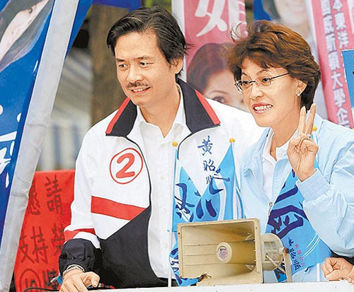 金溥聰4日陪黃昭順掃街拜票,再為“棄黃保楊”消毒。圖片來源:臺灣媒體
